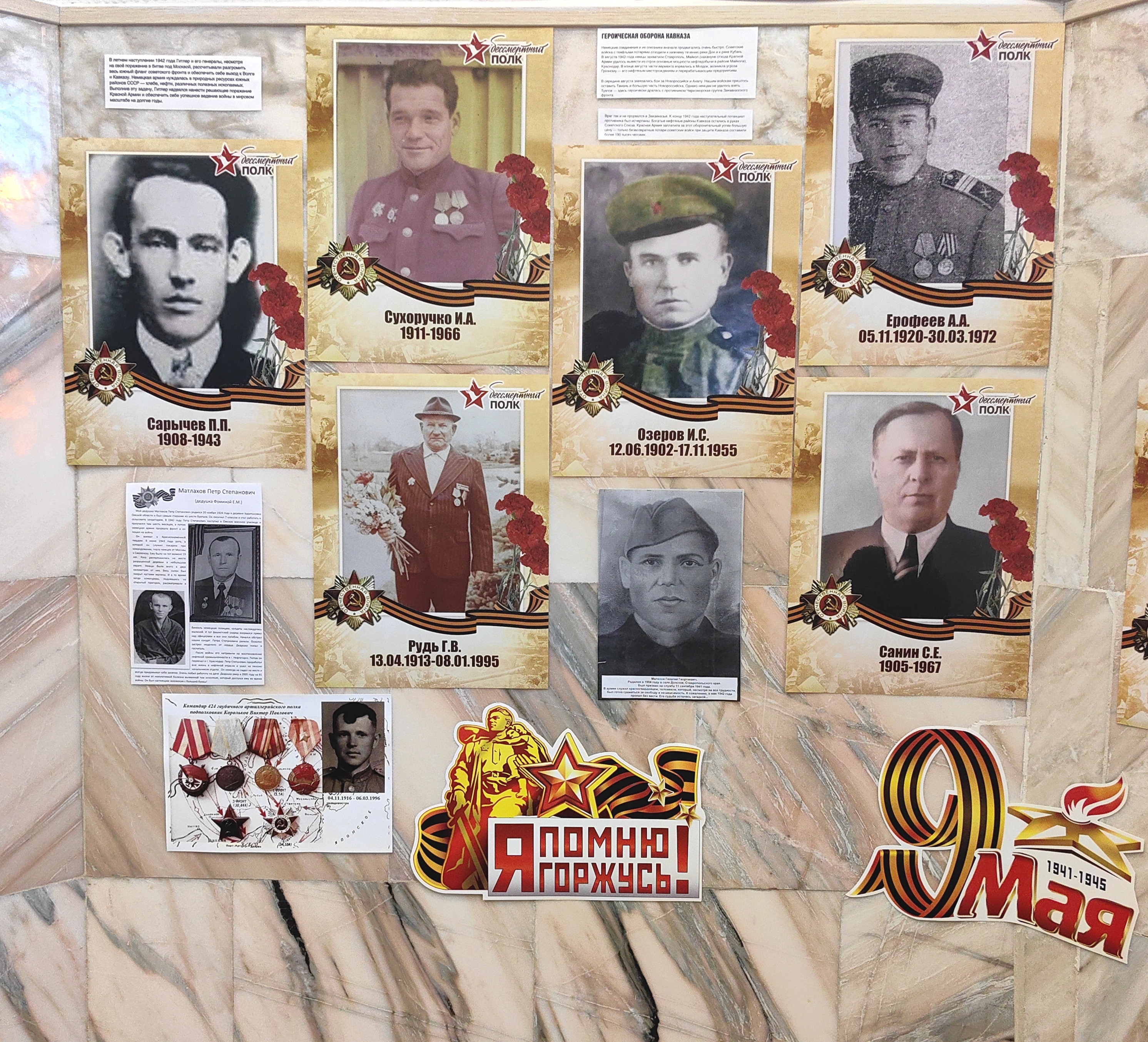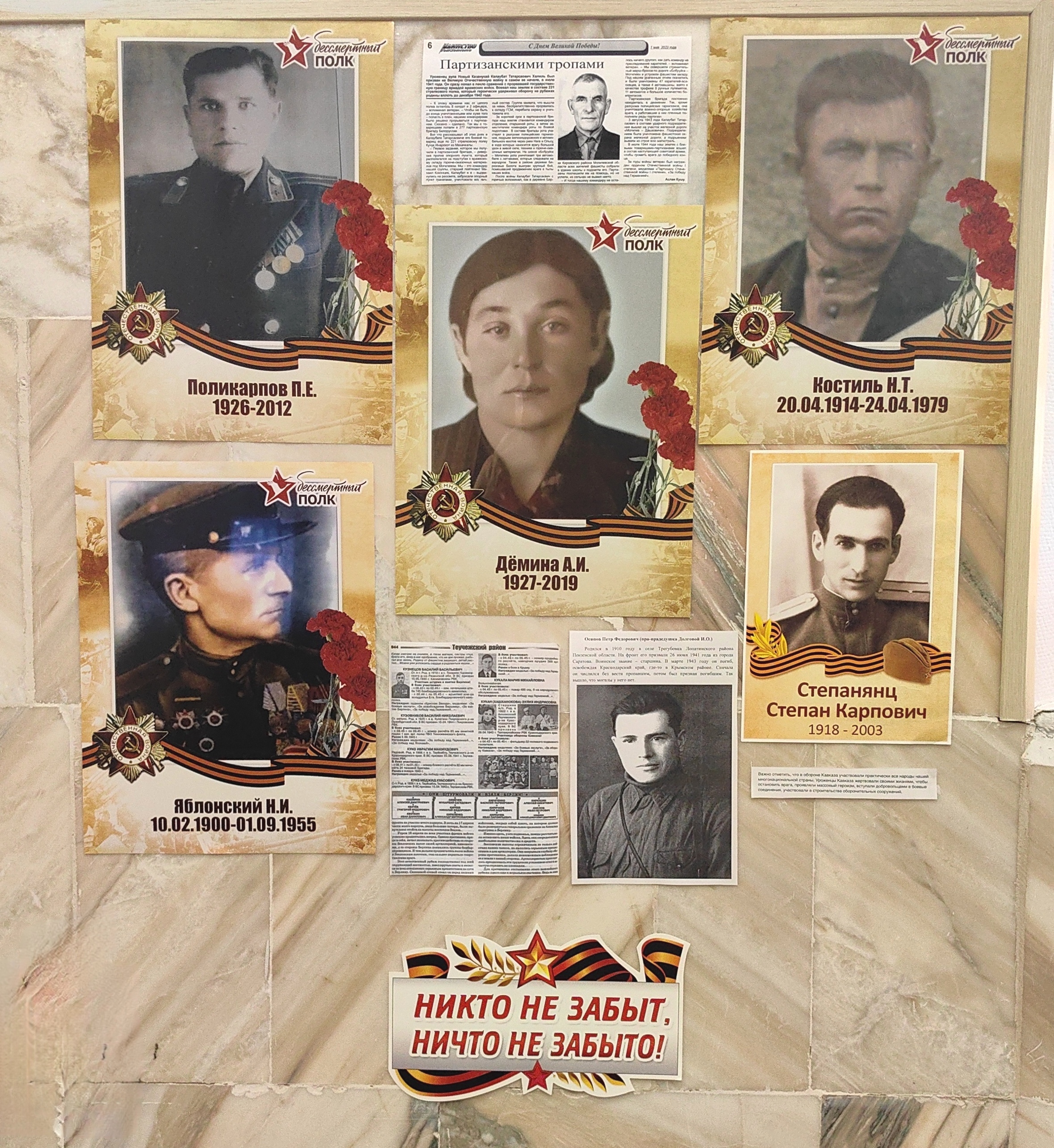 Памятная экспозиция посвящена участникам Великой Отечественной войны. На ней размещены фотографии ветеранов родных и близких сотрудников, чьи подвиги стали символом мужества и патриотизма.