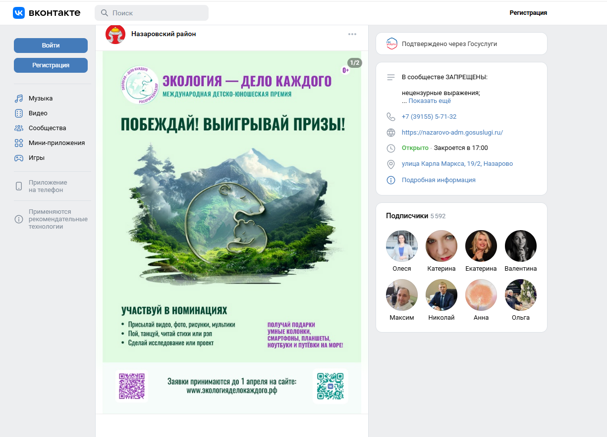 Информация о V сезоне международной детско-юношеской премии «Экология – дело каждого» размещена на официальном сайте Назаровского района Красноярского края, официальных сайтах сельсоветов, в социальных сетях и мессенджерах в информационно-телекоммуникационной сети «Интернет». А также информация о проведении V сезона Премии направлена во все образовательные учреждения Назаровского района.