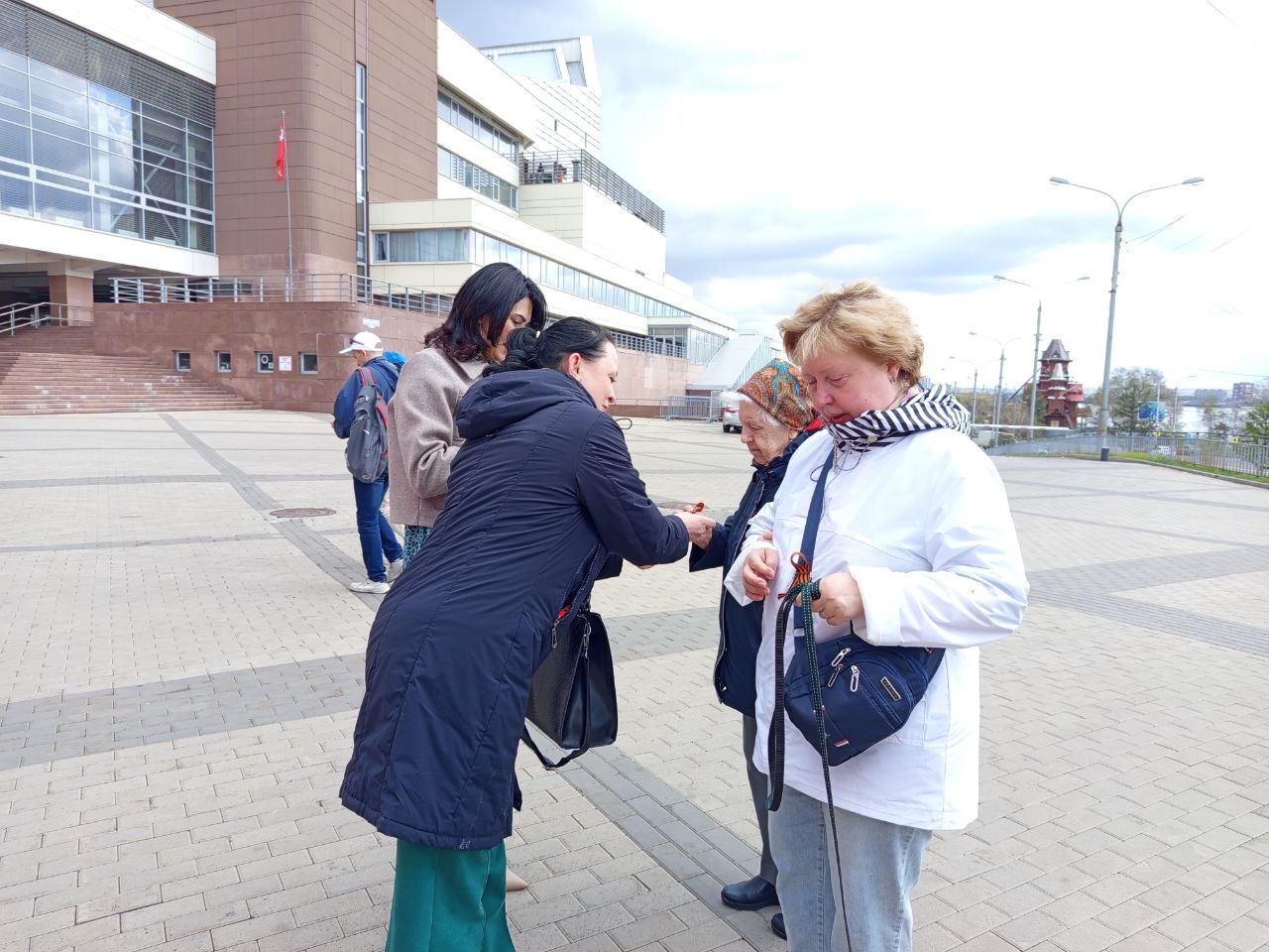 7 мая представители Управления раздавали на улицах города жителям Красноярска георгиевские ленты и памятки с правилами их ношения.