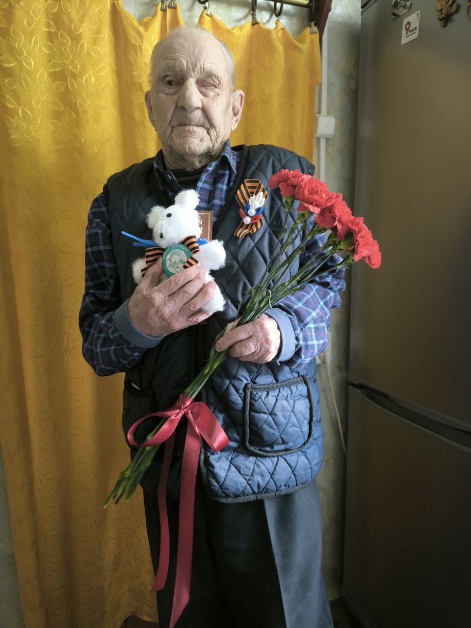 В знак признательности и уважения к старшему поколению и за личный вклад в достижении победы над фашизмом заместитель руководителя Управления Павел Соколов от души поздравил Константина Александровича с приближающимся праздником, пожелал крепкого здоровья, вручил цветы, продуктовый набор и мягкую игрушку мишку Умку-символ премии «Экология-дело каждого», сшитую в рамках акции Росприроднадзора «Игрушка ветерану».