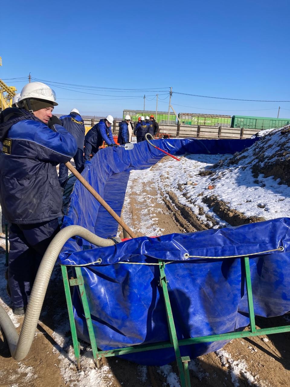 Проведена разведка места условного разлива мазута и оцепление зоны ЧС; осуществлена локализация путем установки подпорных стенок емкостей ПВХ и земляных насыпей с покрытием ПВХ.
