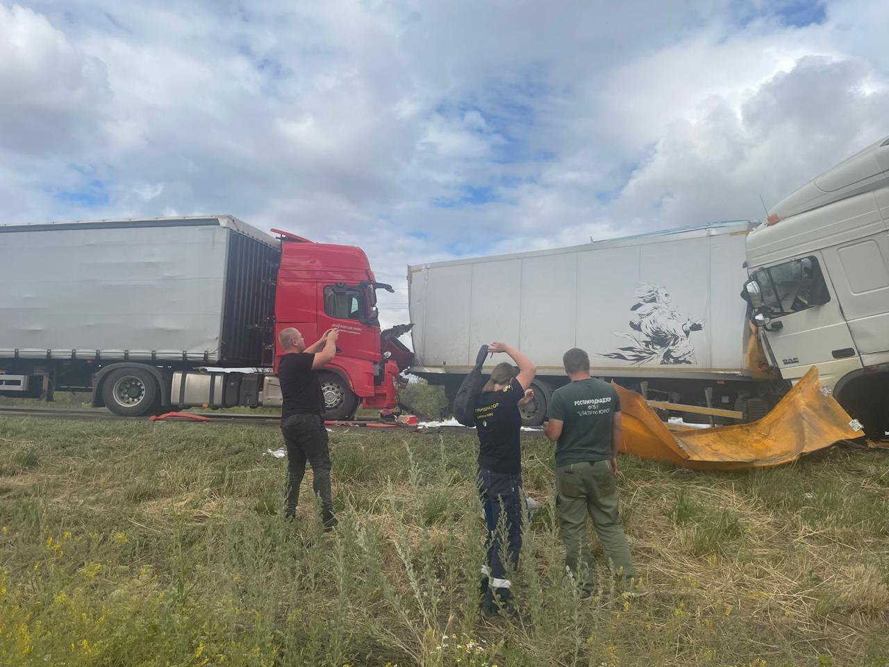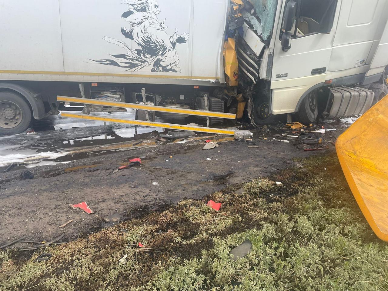 В ходе выезда установлено, что вследствие дорожно-транспортного происшествия с участием трех грузовых автомобилей произошел излив нефтепродуктов на почву.