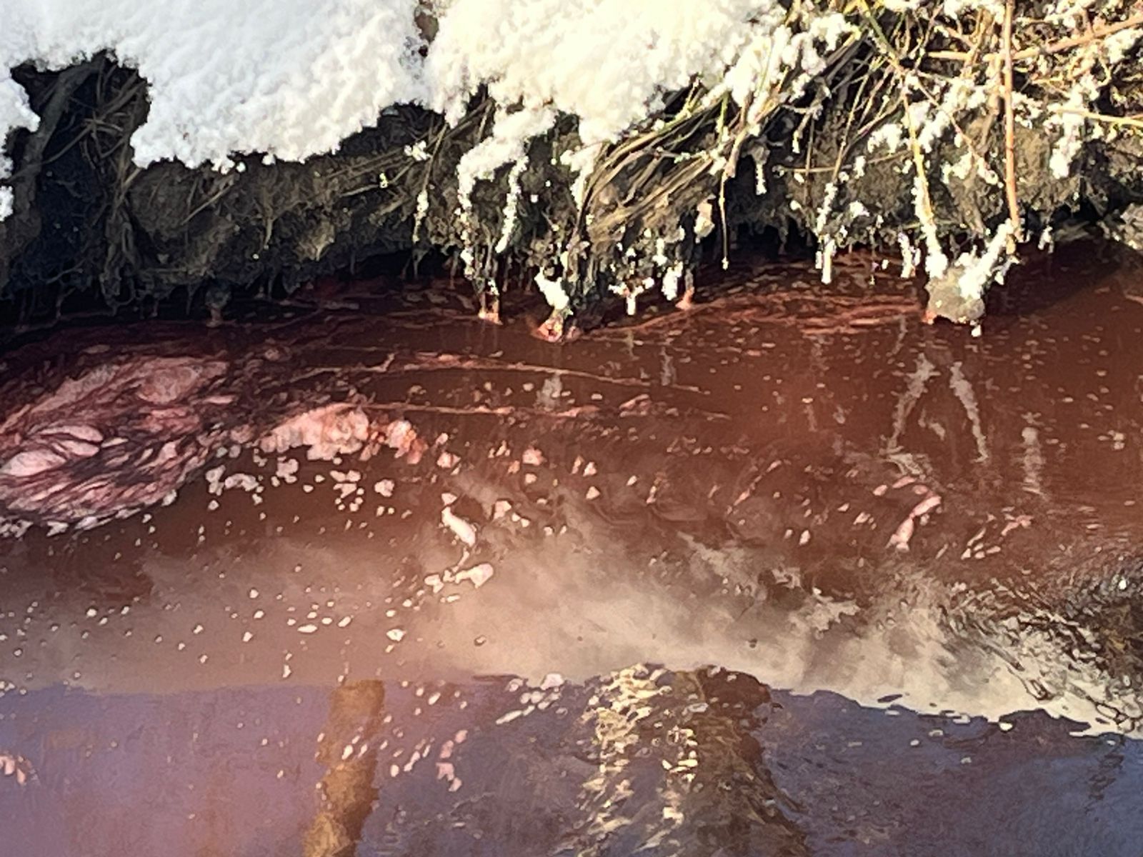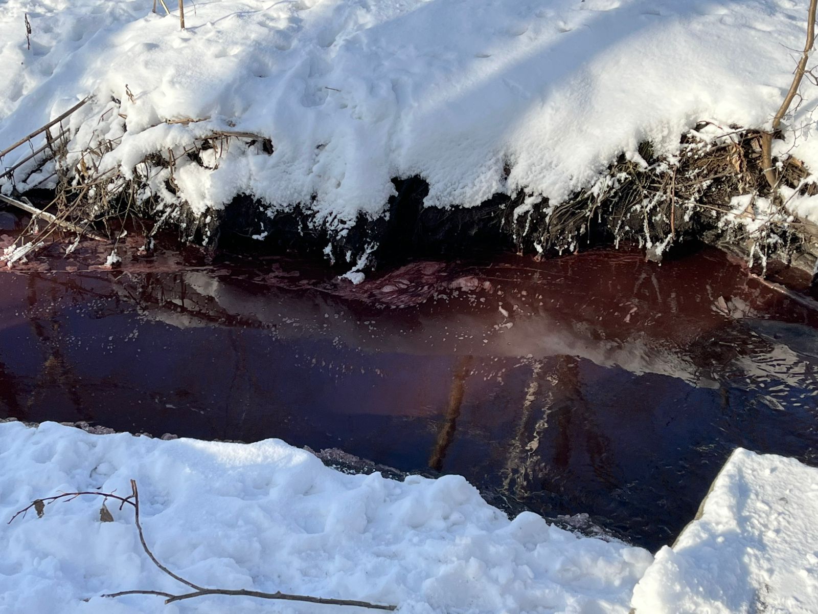 Исходя из данных рельефа сток из трубы является постоянным. На момент осмотра сточная вода имела красновато-розовый цвет, наблюдалось наличие пены, стойкий запах канализационных стоков, что свидетельствует о возможной врезке хозяйственно-бытовой или промышленной канализации в систему ливневки.