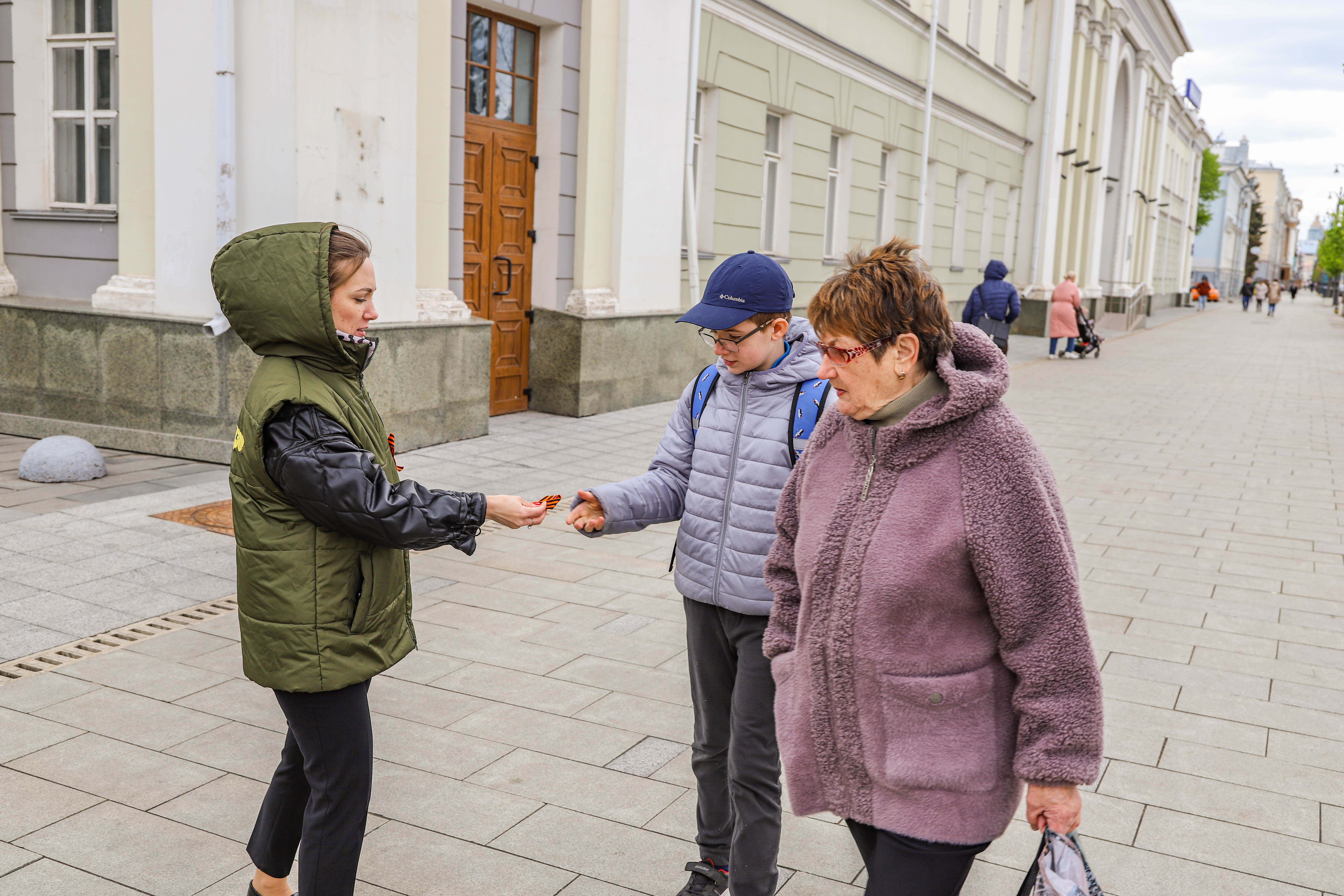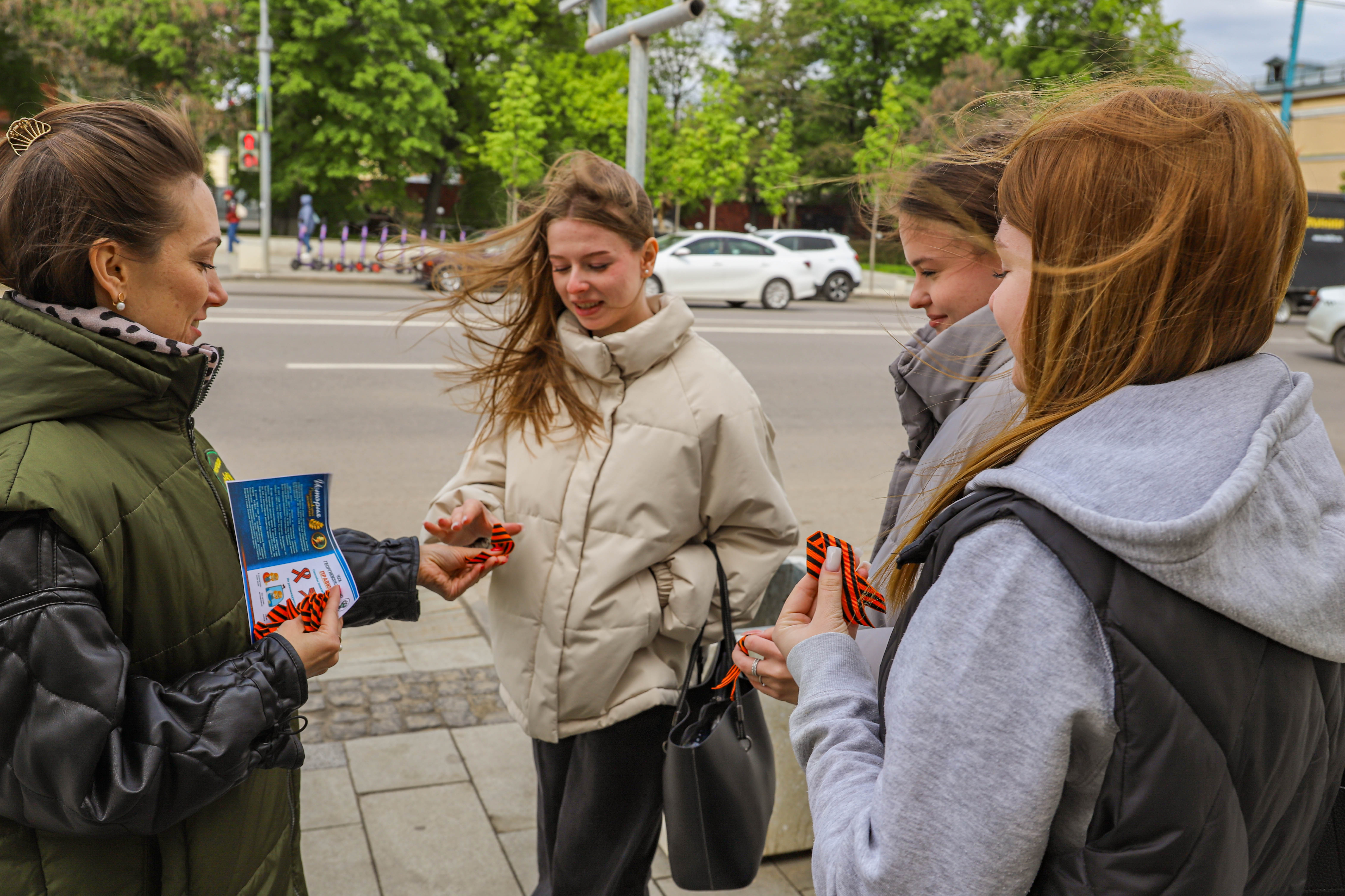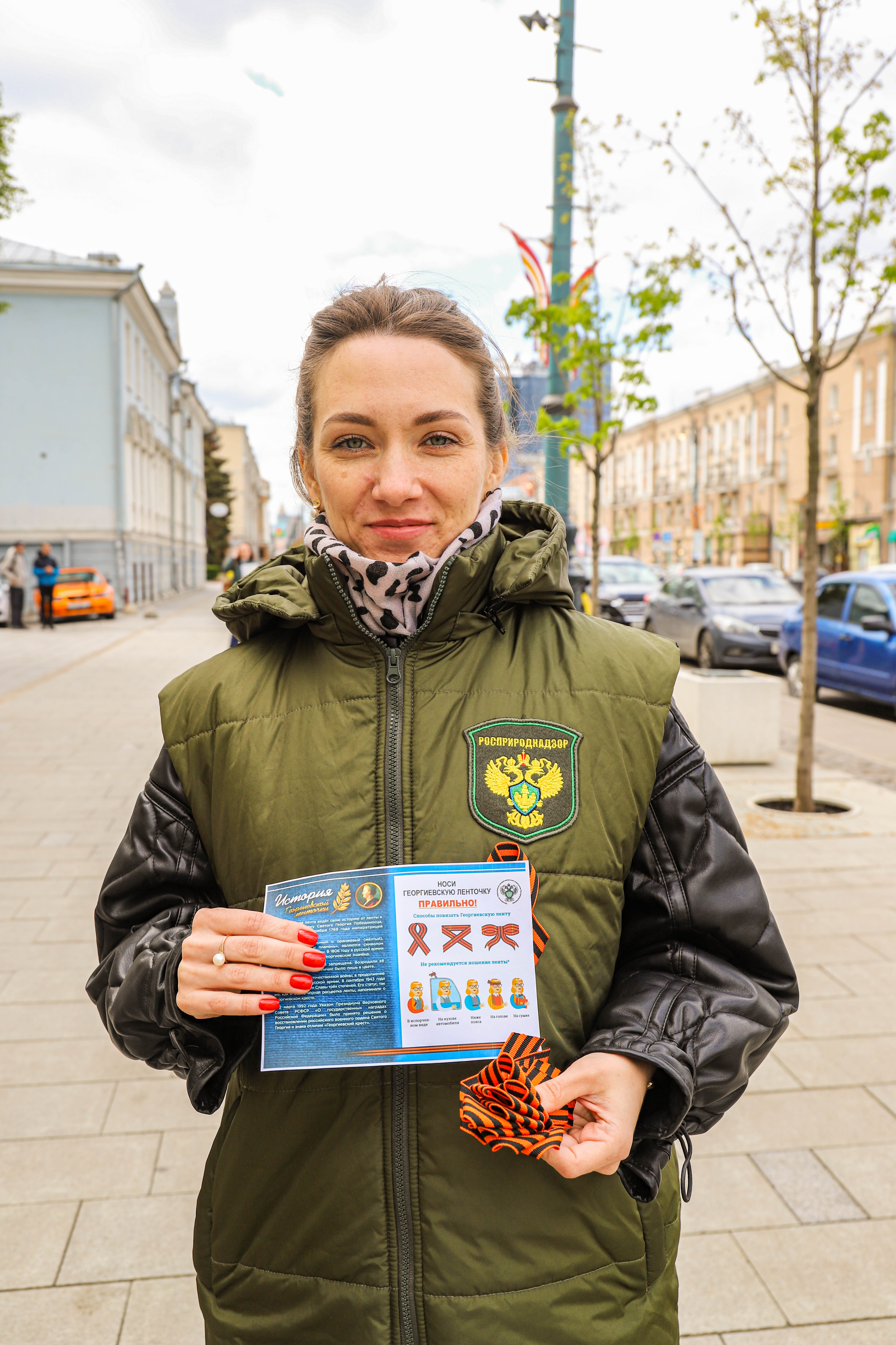 Вместе с символом воинской славы России были вручены листовки с исторической справкой и рекомендациями по правильному ношению ленты.
