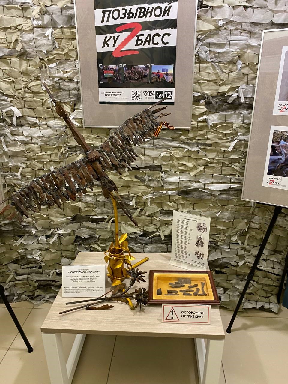 Одним из центральных экспонатов выставки стала композиция «…И превратились в журавлей», которую Евгений Кулеш сделал из привезенных бойцами осколков от снарядов из зоны СВО. Парящий журавль из осколков соединил в себе образы всех солдат, не вернувшихся из боя…