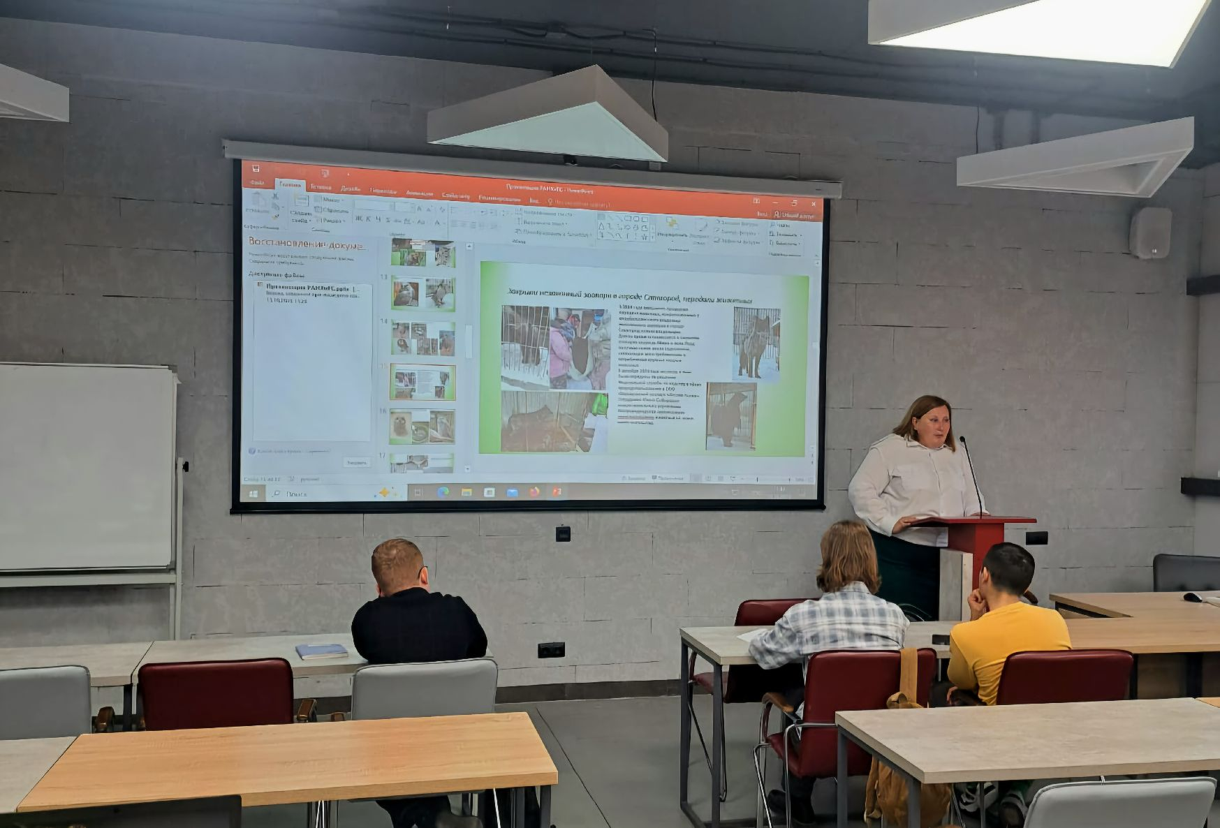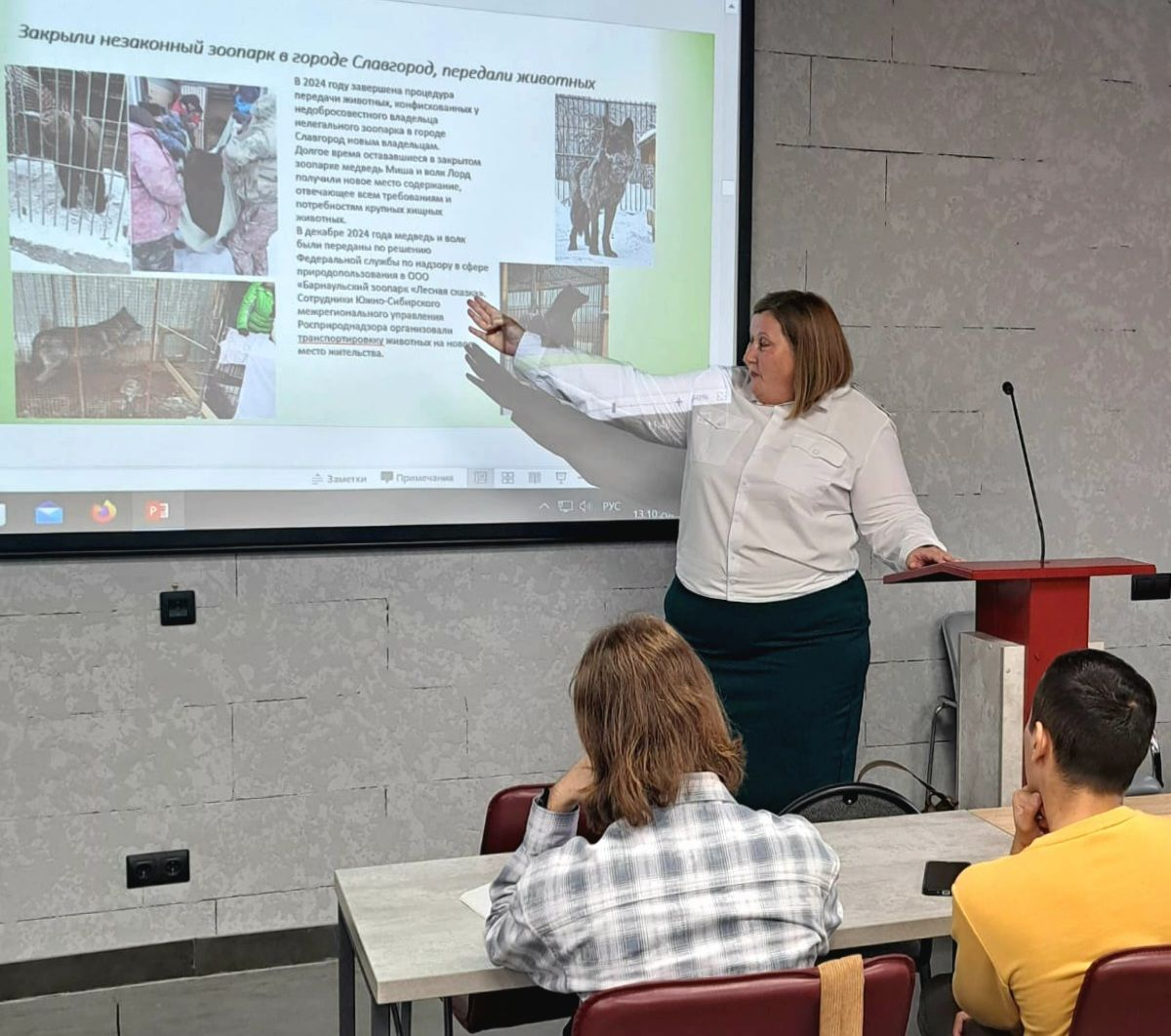 В этот раз студентам рассказали об основных направлениях деятельности Службы, о разграничении полномочий в сфере охраны природы между федеральными и региональными органами власти, о наиболее интересных эпизодах в работе Управления за последние годы, о взаимодействии с органами прокуратуры и иными государственными органами. Особый интерес у студентов вызвали рассказы инспектора о спасении редких животных, их реабилитации и выпуске в природу. Все эти рассказы сопровождались демонстрацией презентации с фотографиями спасенных животных, выявленных свалок и других примеров деятельности Управления.