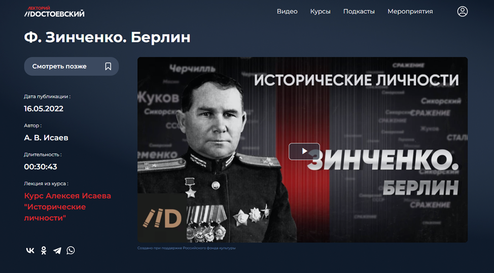 В рамках проведения мероприятий, посвящённых празднованию 80-й годовщины Победы в Великой Отечественной войне 1941-1945 годов, сотрудники Сибирского межрегионального управления Росприроднадзора прослушали онлайн лекцию «Зинченко. Берлин» (https://dostoverno.ru/video/f-zinchenko-berlin) из курса А. Исаева «Исторические личности Великой Отечественной войны».