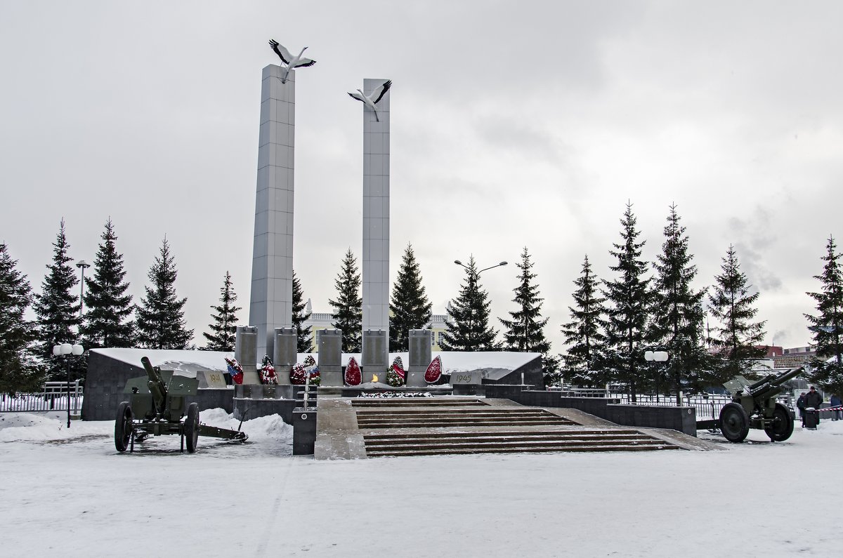 Мемориал «Журавли» представляет собой̆ две 16-метровые стелы, облицованные металлом. На вершинах укреплены летящие журавли: весом каждая птица по 230 кг, размах крыльев — три метра.