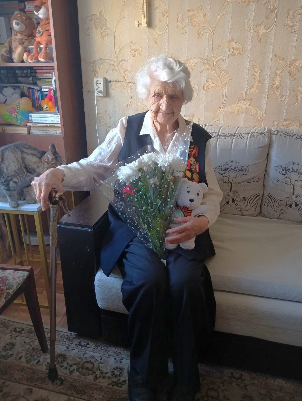 Клавдию Евдокимовну поздравили с 80-летие Победы в Великой отечественной войне, вручили ей игрушку Умку, сделанную в рамках акции «Игрушка ветерану», и выразили глубокую признательность за стойкость и неоценимый вклад в Победу.