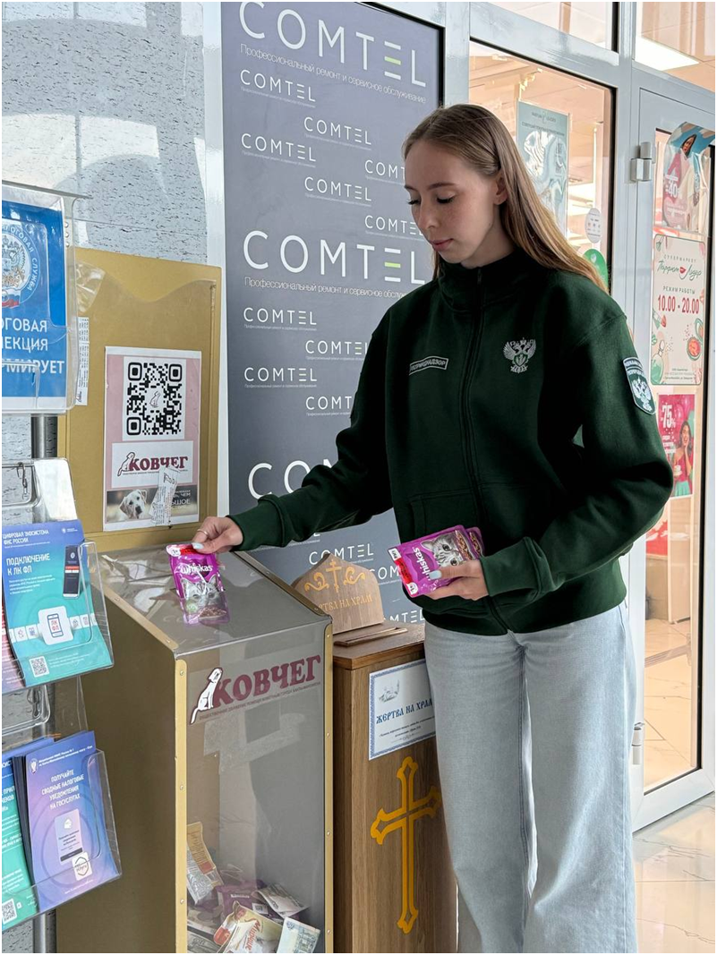 передача в пункт сбора помощи животным «Ковчег» и в приют для животных без владельцев «Велес» гуманитарной помощи, подкормка животных и птиц в стационарно установленных кормушках, обеспечение приюта и питания бездомного кота сотрудником в г. Ханты-Мансийске.