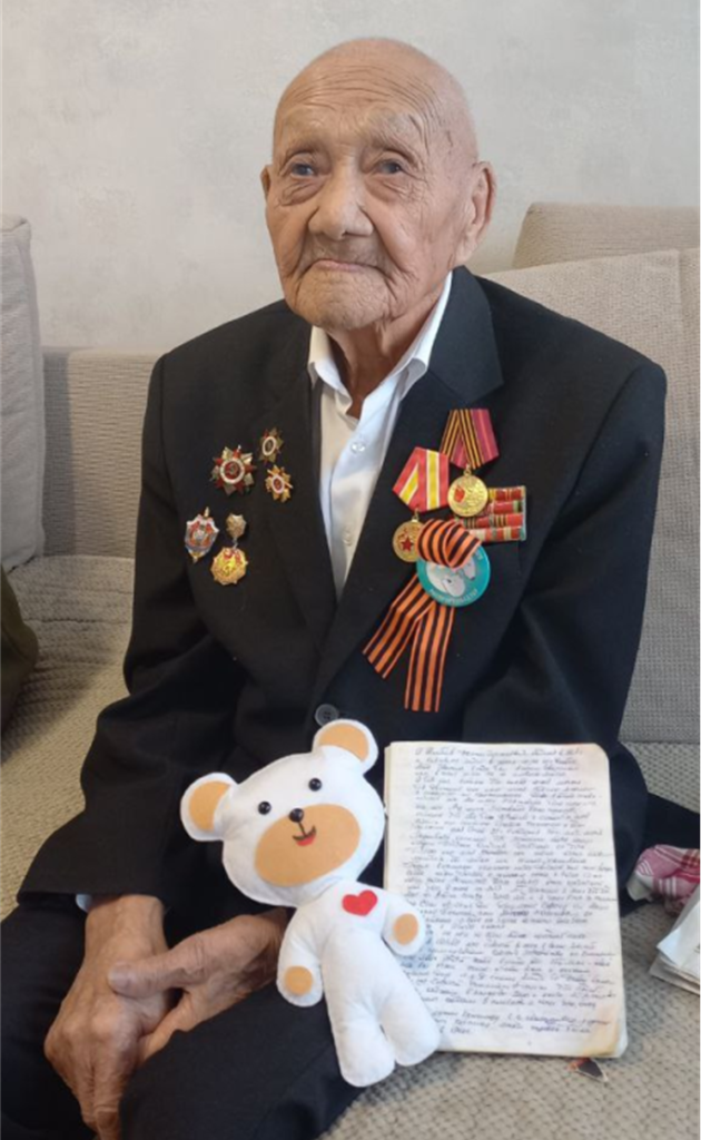 Самым старшим из чествуемых ветеранов оказался Голощапов Иван Тимофеевич, который родился 9 декабря 1923 года. 101 год никак не стали помехой для разговора. Родом Иван Тимофеевич из Воронежской области. После окончания бронетанкового училища в 1942 году был направлен во вторую гвардейскую дивизию ордена Боевого Красного Знамени на должность командира танка. После нескольких тяжелых ранений он продолжил службу в военных училищах, в военных комиссариатах Республики Бурятия. Является одним из организаторов Октябрьского военкомата г. Улан-Удэ. Награжден орденами «Отечественной войны» I и II степени, медалями «За боевые заслуги», «За победу над Германией».