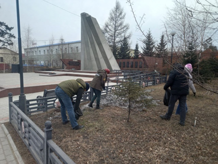 Сотрудники Управления очистили территорию комплекса от накопившегося за зиму мусора. По завершении работ они почтили память погибших воинов минутой молчания у «Вечного огня».